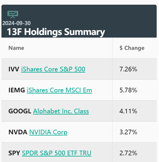 桥水的持仓较为分散,前十大持仓标的仅占总持仓市值的32.29%。前五大持仓标的分别是iShares核心标普500ETF(IVV)与iShares核心MSCI新兴市场ETF(IEMG)、谷歌A、英伟达和SPDR标普500ETF信托(SPY)。
