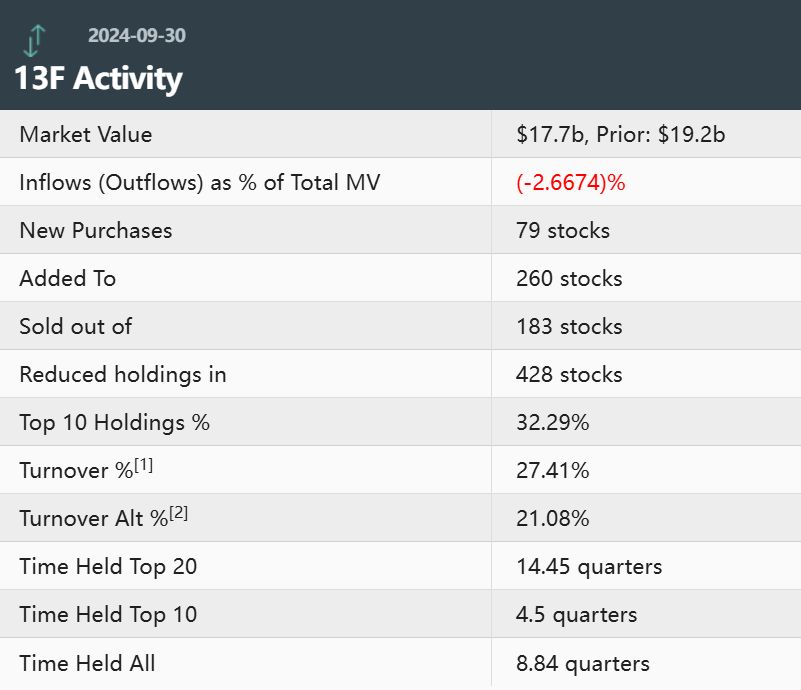 截至第三季度末,桥水持仓股的总市值为177亿美元,相较于前一季度的192亿美元环比下滑约7.8%。桥水在第三季度新建仓79个标的,加仓260个标的,清仓183个标的,减持428个标的。